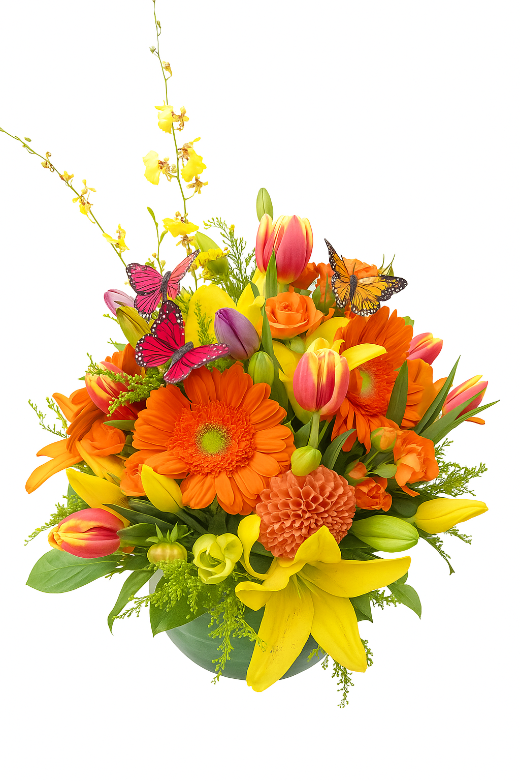 Bursting with color and charm, this bouquet features bright Gerbera daisies, sunny lilies, vibrant tulips, roses, and orchids, accented with lush greenery and playful butterflies. Arranged in a clear glass vase, it’s the perfect way to celebrate, gift, or brighten any space.