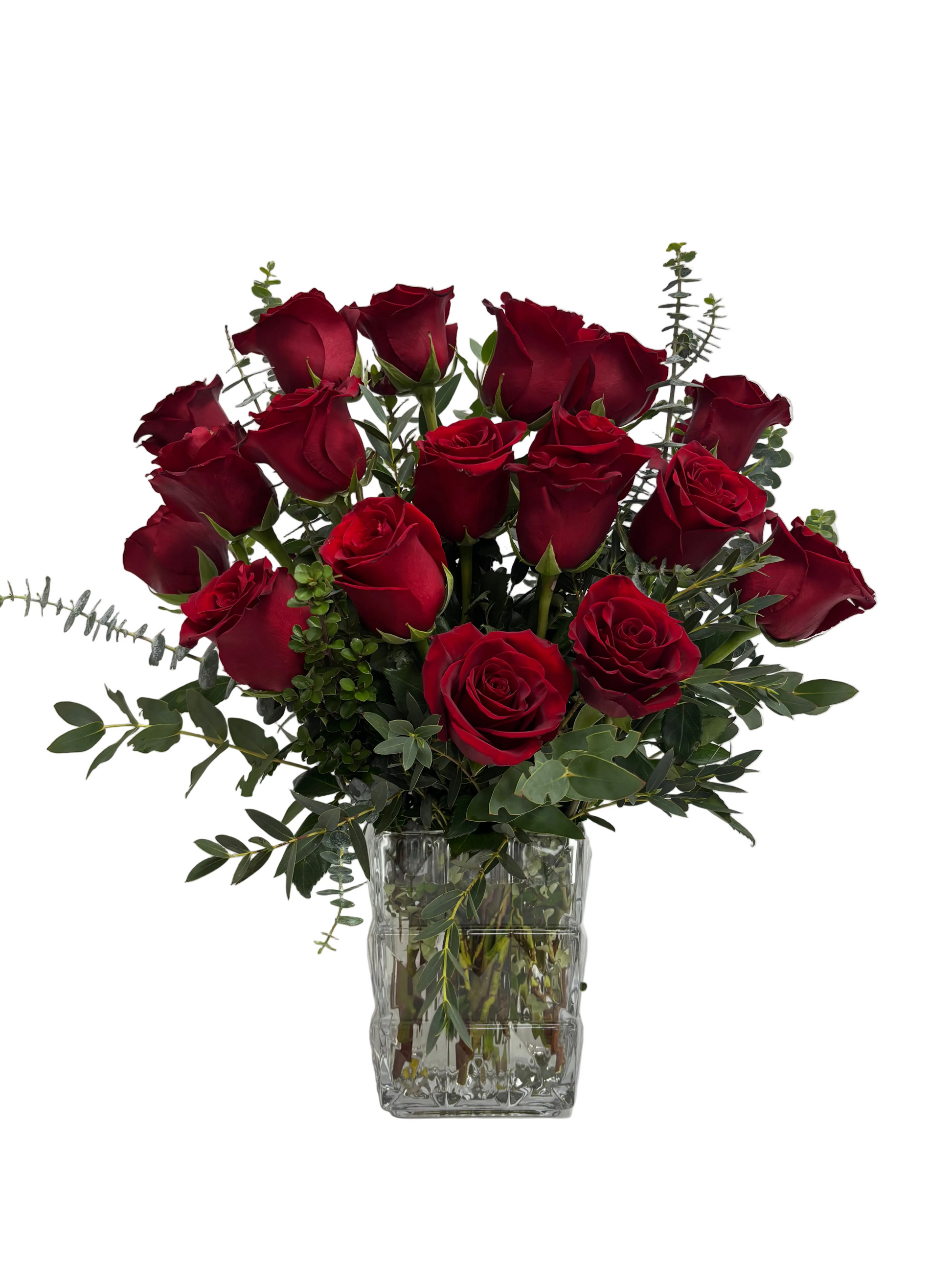 Our Classic Crimson Radiance arrangement is a masterclass in timeless elegance, featuring 18 premium, long-stemmed red roses nestled among fresh, fragrant eucalyptus and seasonal greenery for a lush, architectural silhouette. This stunning bouquet is presented in a sophisticated, heavy-weighted glass vase characterized by a modern geometric texture that captures and reflects light beautifully. Perfectly balanced between traditional romance and contemporary style, this arrangement serves as an exquisite centerpiece or a profound romantic gesture that arrives ready to display and admire.