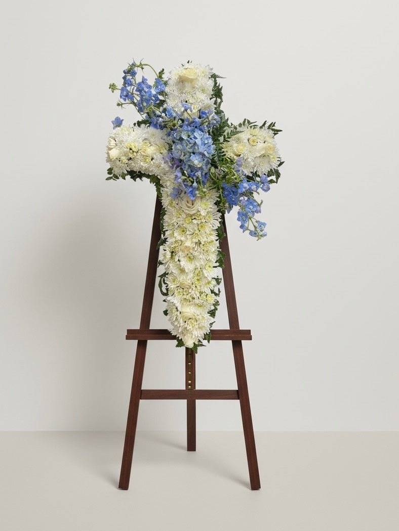 Pay tribute with this elegant Funeral Cross Standing Spray, thoughtfully arranged with fresh white and blue flowers. Designed in a classic cross shape, it features a harmonious mix of seasonal blooms to express love, sympathy, and respect. Perfect for funeral services or memorials, this standing spray conveys a heartfelt message of remembrance. Flower varieties may vary based on seasonal availability to ensure the freshest design.