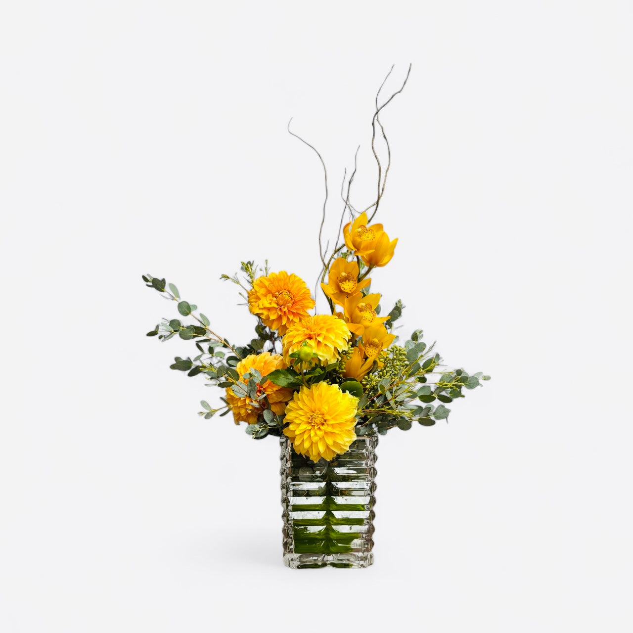 Bright and cheerful, this stunning yellow flower arrangement features radiant dahlias paired with exotic orchids. Designed to bring warmth and joy, with its modern elegance and vibrant color palette, this arrangement makes a memorable gift or centerpiece. Flower varieties may vary based on seasonal availability to ensure the freshest design.