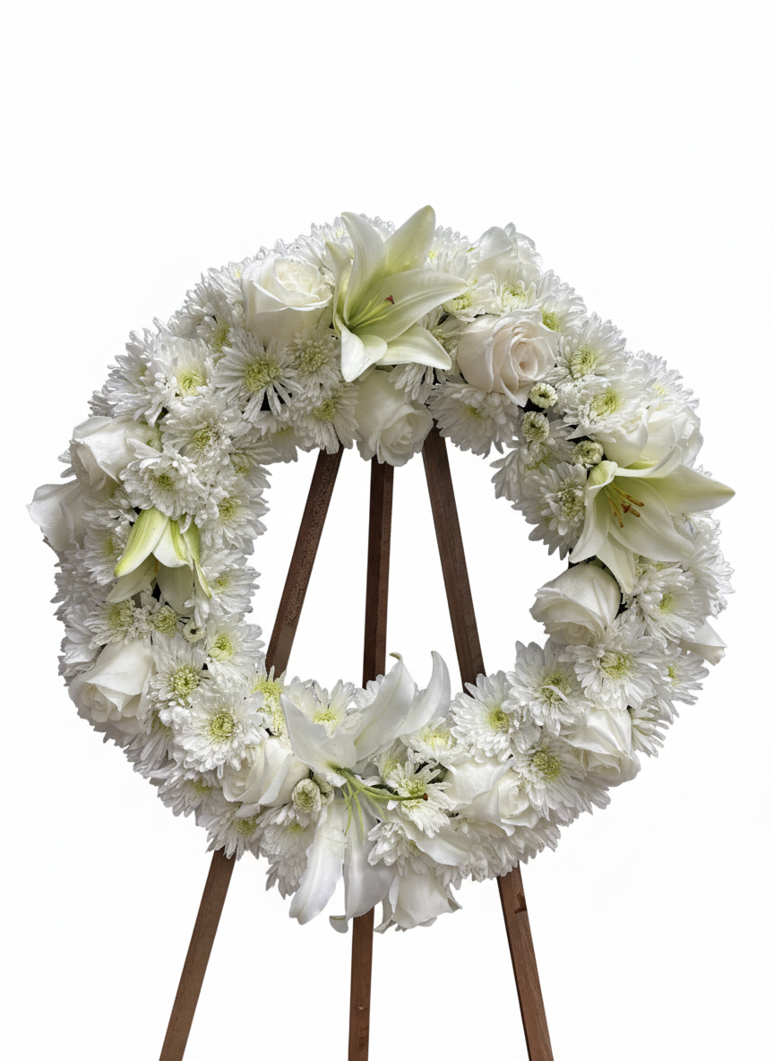 A serene and elegant open wreath crafted entirely in white, featuring roses, lilies, and poms. This classic arrangement conveys sympathy and heartfelt remembrance, making it a respectful tribute for a funeral or memorial service.