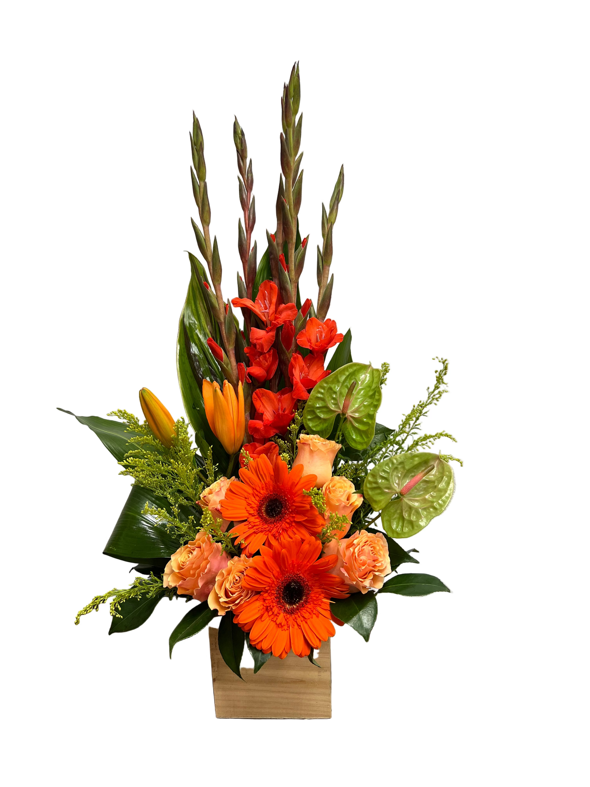 A bold, artistic arrangement designed to impress. Striking red gladiolus rise gracefully above vibrant Gerbera daisies, lilies, and roses, while exotic green anthuriums add a contemporary touch. Styled in a sleek wooden container, this modern design blends natural warmth with sophisticated flair—perfect as a centerpiece or a statement gift.