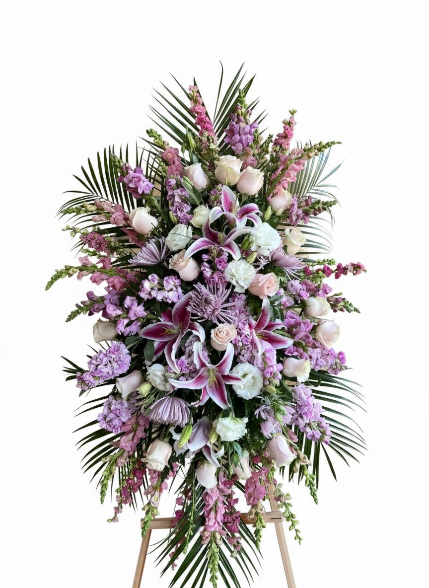 Express heartfelt sympathy with this elegant standing spray in soft tones of pink, white, and lavender. Featuring a graceful blend of roses, lilies, carnations, snapdragon, stock, and seasonal blooms, it’s beautifully arranged to convey comfort, love, and remembrance. Designed with care, this tribute offers a serene expression of support and compassion during a difficult time.
