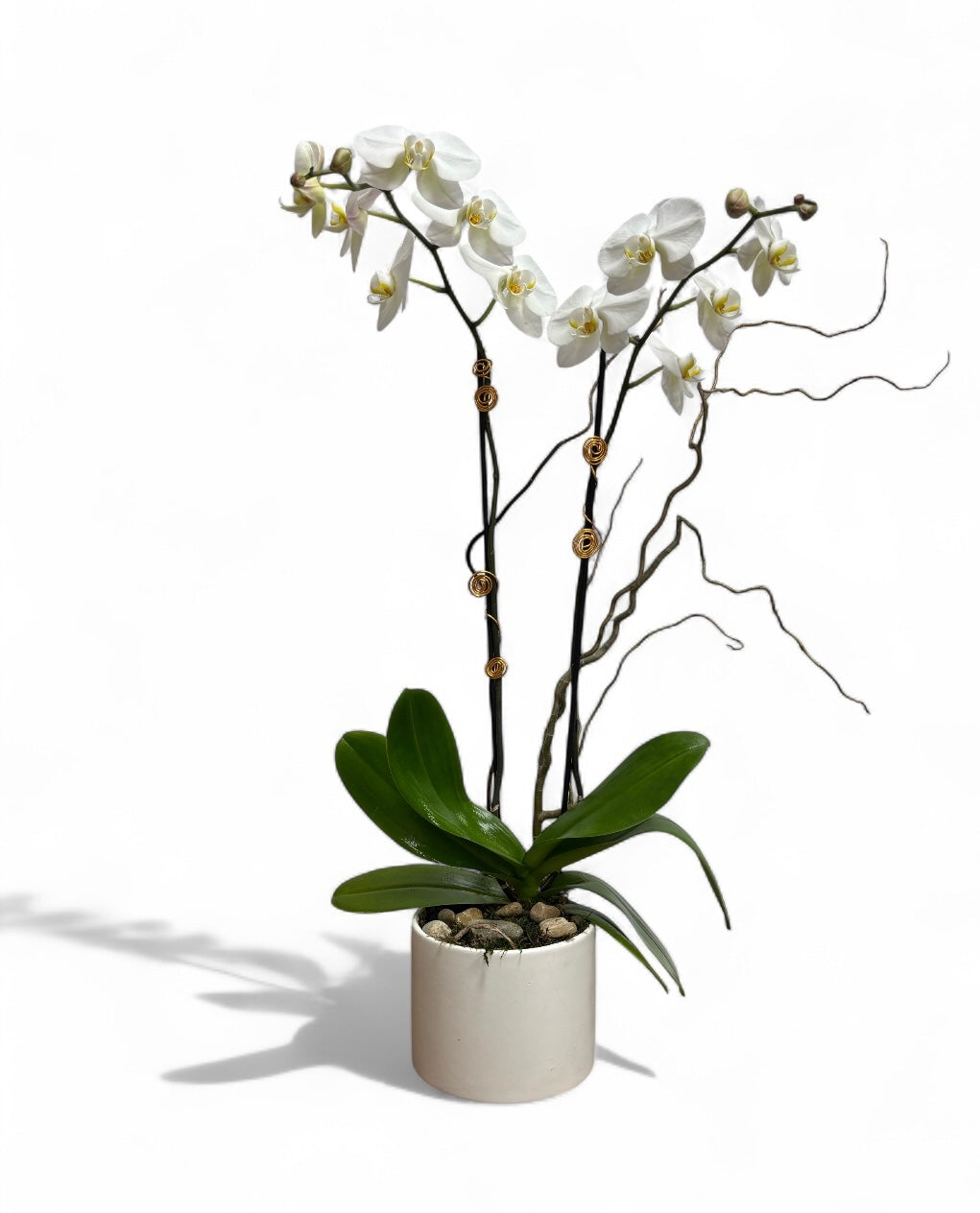 A timeless and elegant display featuring a simple double white Phalaenopsis orchid, beautifully presented in a sleek white ceramic container. This classic design brings sophistication and natural beauty to any space, making it a perfect gift or décor piece.