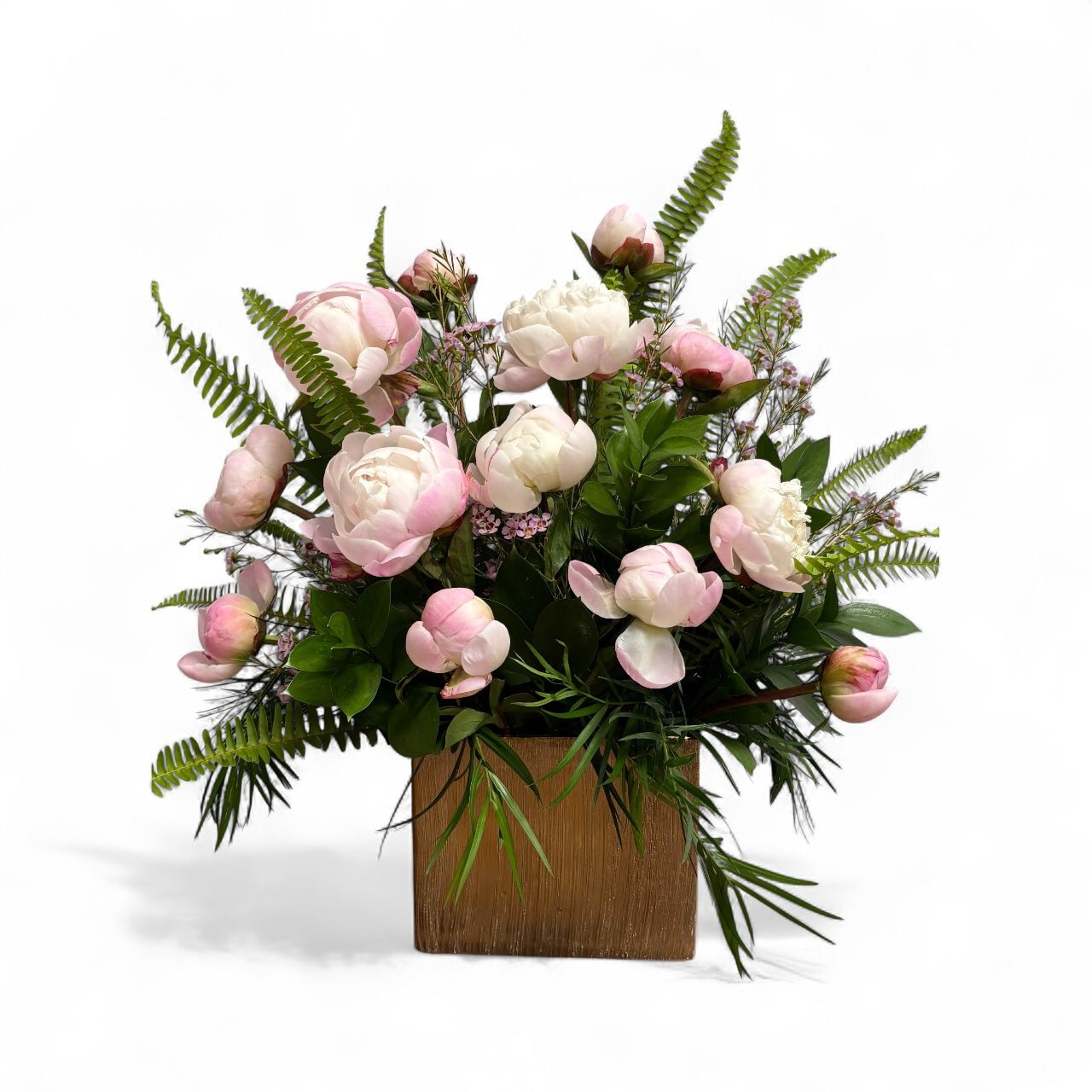 A romantic and elegant arrangement featuring lush pink peonies beautifully designed in a gold rectangular vase. Accented with fresh greenery, this sophisticated display adds a touch of luxury and charm to any space or occasion.