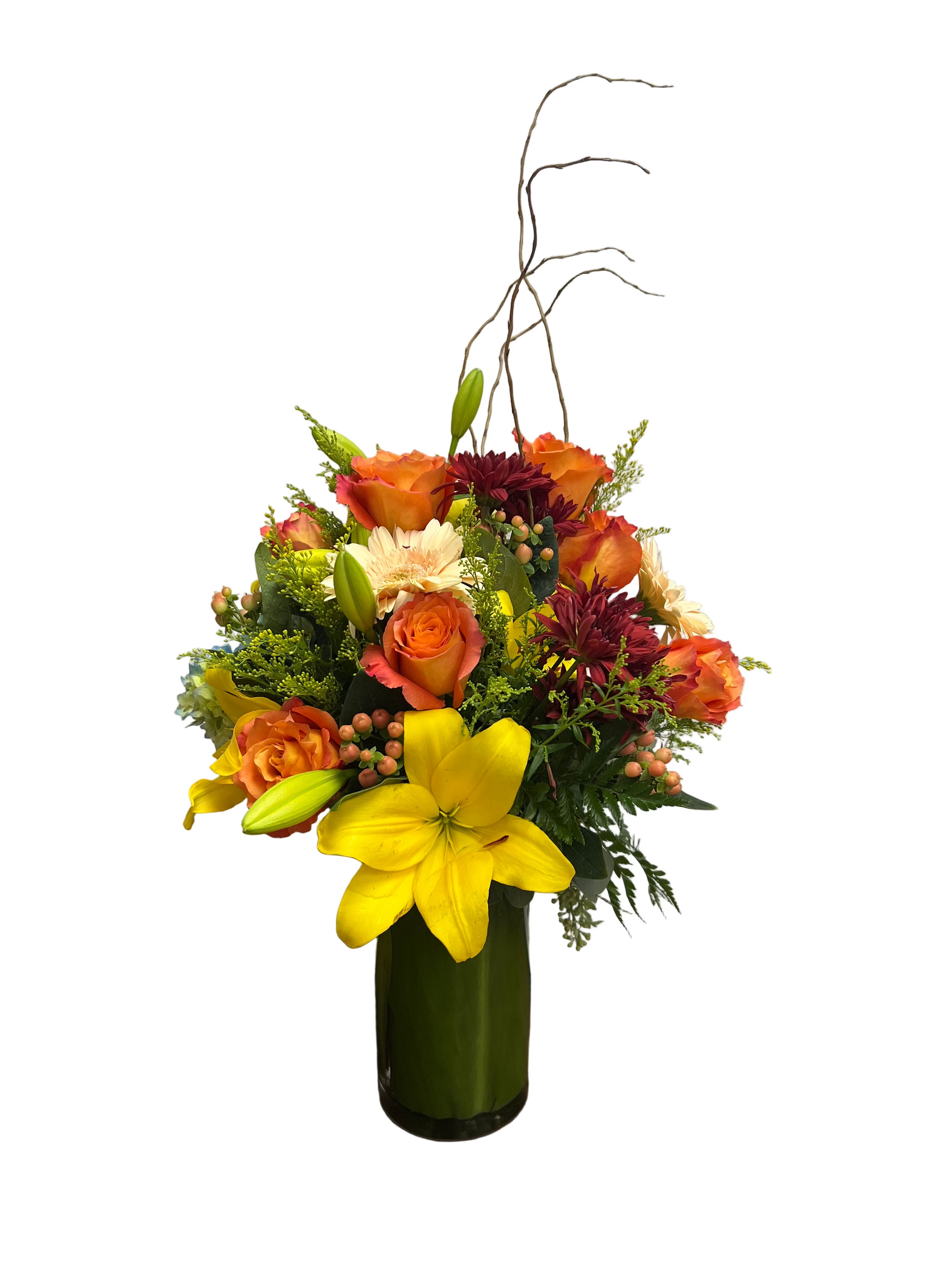 Brighten any space with this cheerful and vibrant bouquet. Lively yellow and orange blooms are elegantly arranged in a clear vase, with lush green leaves thoughtfully wrapped inside to create a fresh, modern, and luxurious look. Perfect for celebrations, home décor, or as a thoughtful gift that radiates warmth and joy.