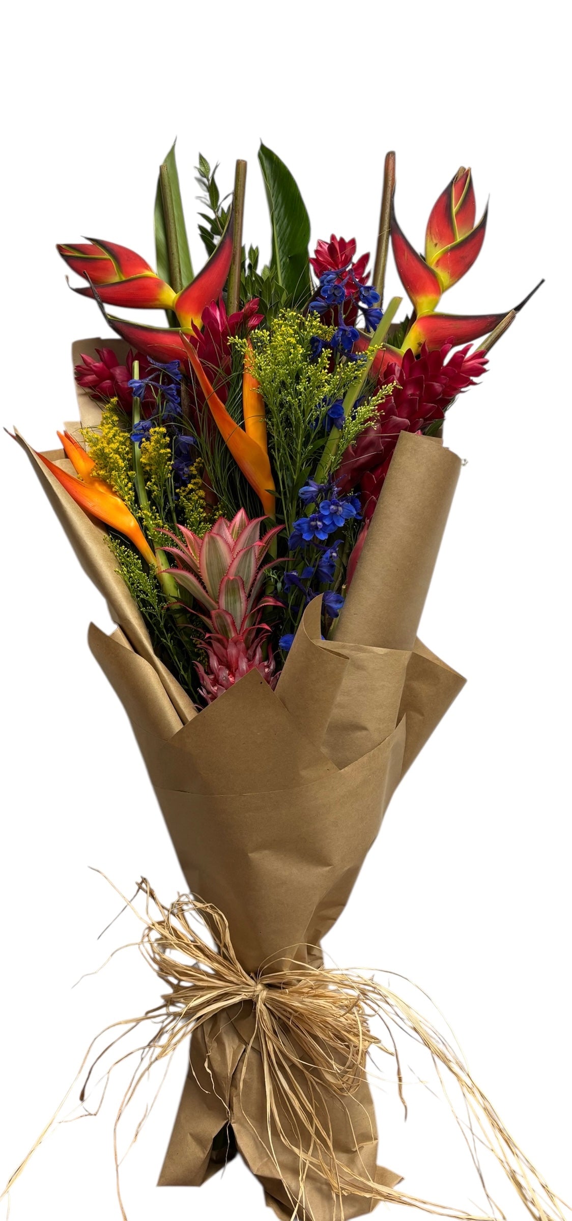 A charming and vibrant wrapped bouquet featuring a selection of tropical flowers, thoughtfully arranged to showcase their natural beauty. The blooms are wrapped in rustic brown paper and tied with raffia, creating a casual yet elegant presentation perfect for any occasion.