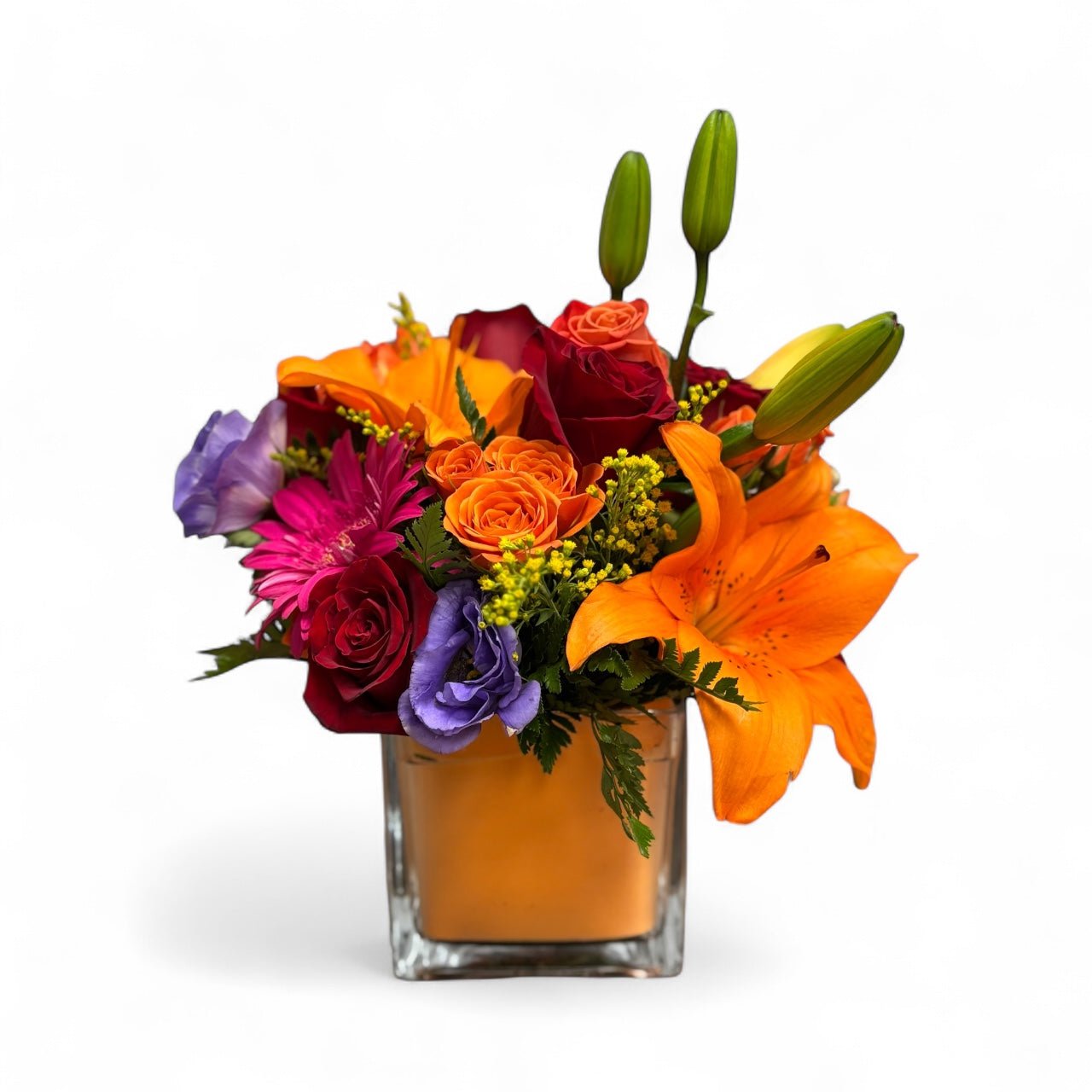 A vibrant and modern floral display, this arrangement features roses and spray roses, lilies, Gerbera daisies, and lisianthus in striking shades of orange, hot pink, and purple. Perfect for adding a bold pop of color to any space, the blooms are artfully arranged in a clear cube vase for a contemporary and elegant presentation.